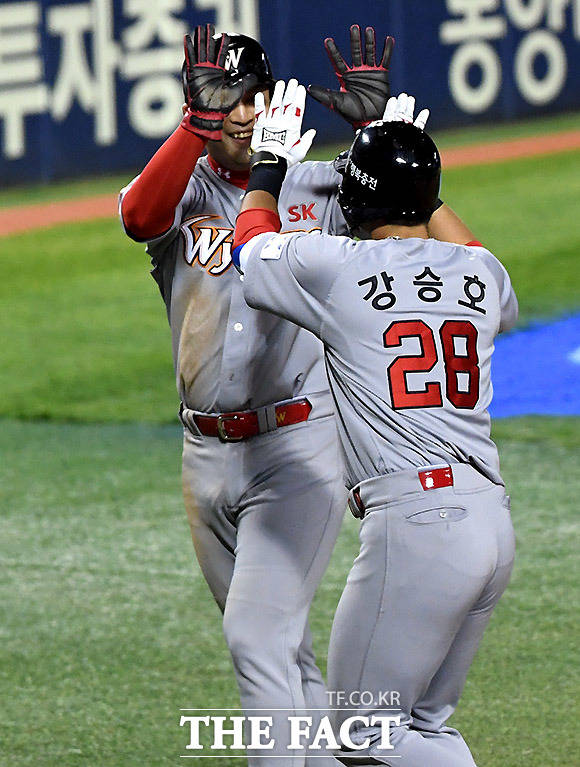 [더팩트ㅣ잠실야구장=이효균 기자] '2018 신한은행 마이카 KBO 한국시리즈 6차전' 두산 베어스-SK 와이번스의 경기가 12일 오후 서울 송파구 잠실야구장에서 열린 가운데 4회초 SK 강승호가 투런 홈런을 치고 있다.