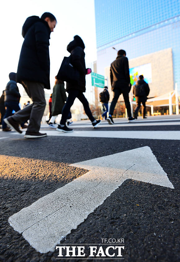 2019년 새해 첫 출근일인 2일 오전 서울 마포구 상암로 인근 직장인들이 출근을 위해 힘차게 발을 내딛고 있다. /이선화 기자