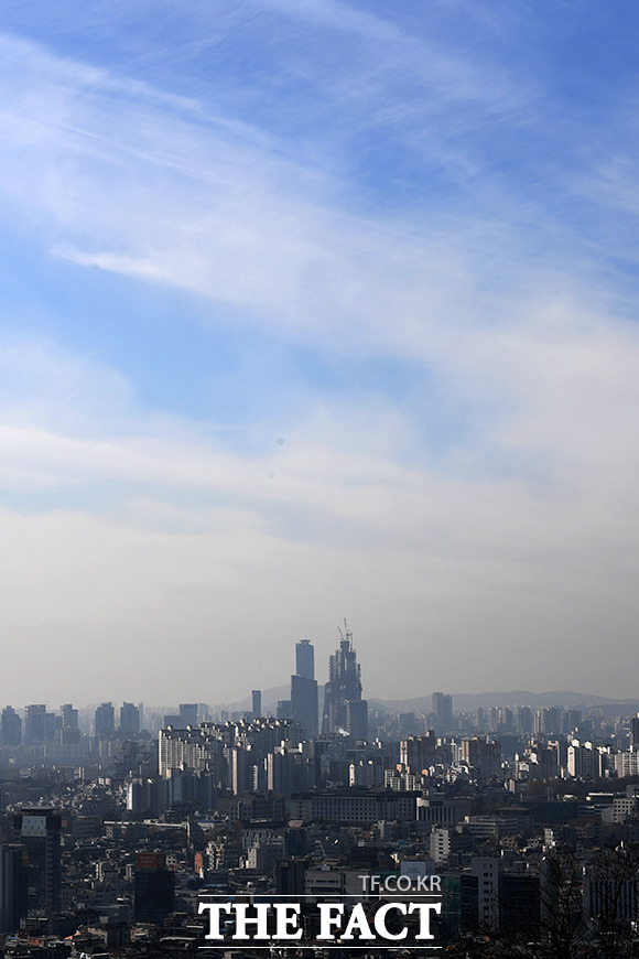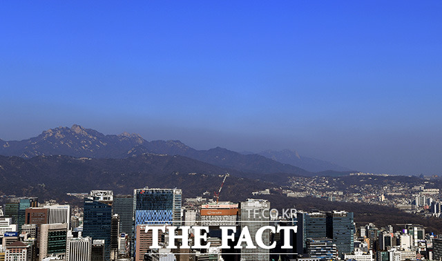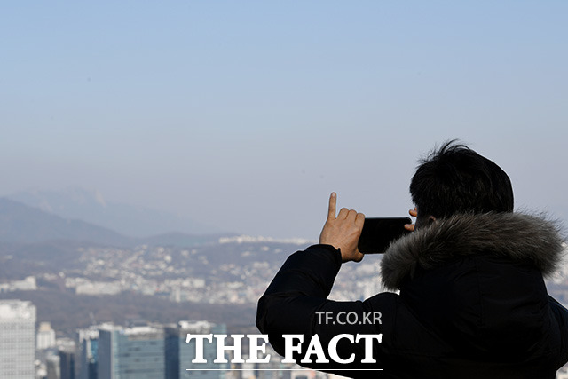 [더팩트ㅣ남용희 기자] 서울 대부분 지역의 초미세먼지 농도가 '나쁨'을 보이고 있는 5일 오후 서울 용산구 남산공원에서 바라본 서울 도심 위로 먼지띠가 형성돼 있다.