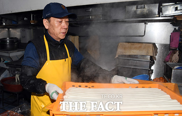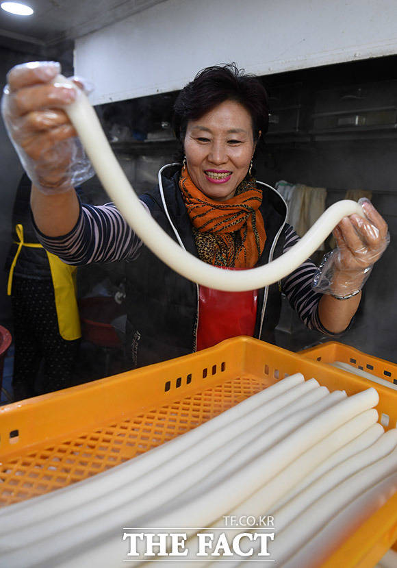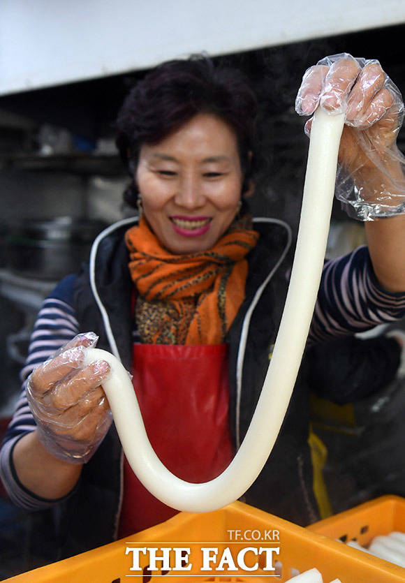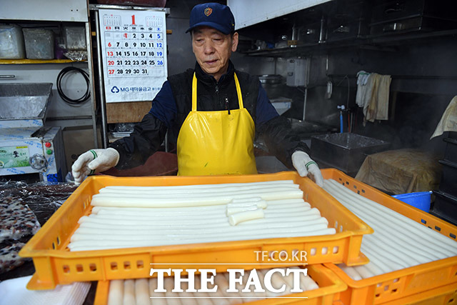 [더팩트ㅣ용인=임영무 기자] 설을 앞둔 25일 오후 경기도 용인시 처인구 중앙시장의 한 떡집 상인이 갓 만든 가래떡을 보며 미소를 짓고 있다.