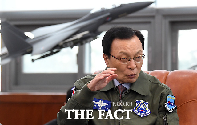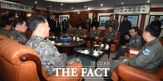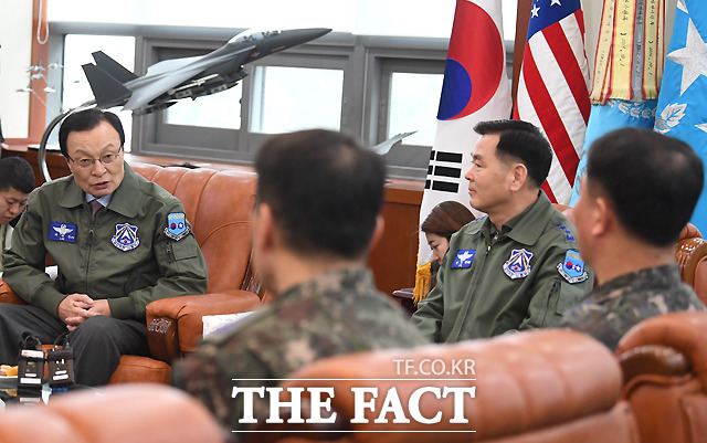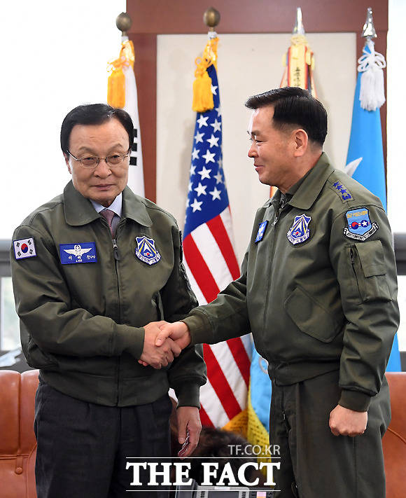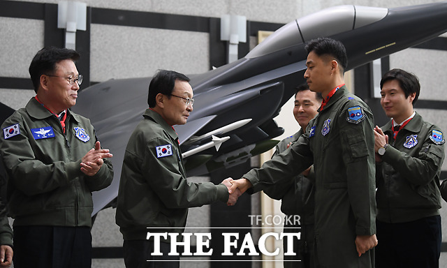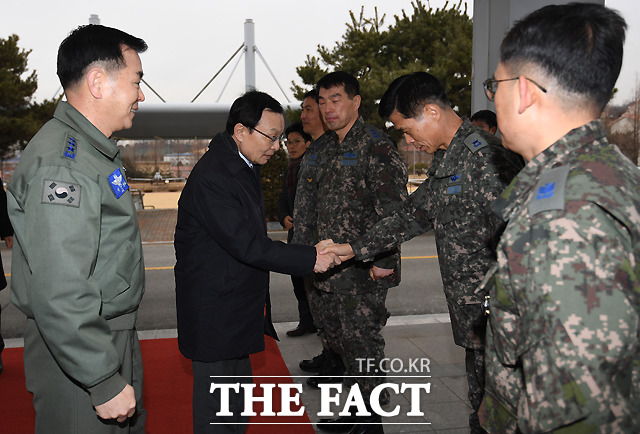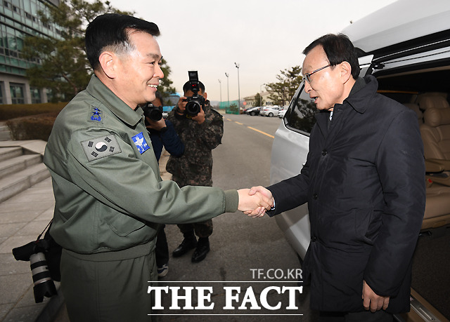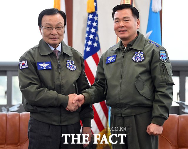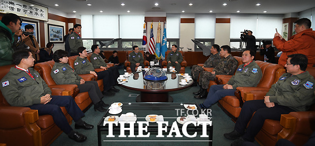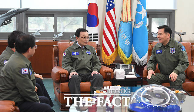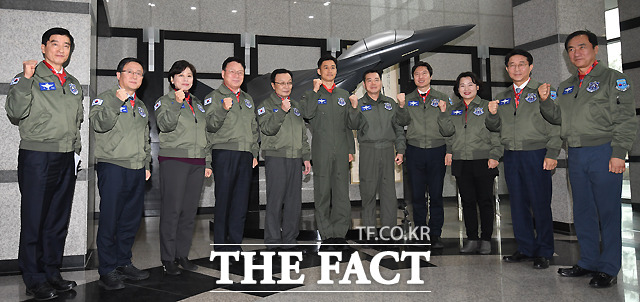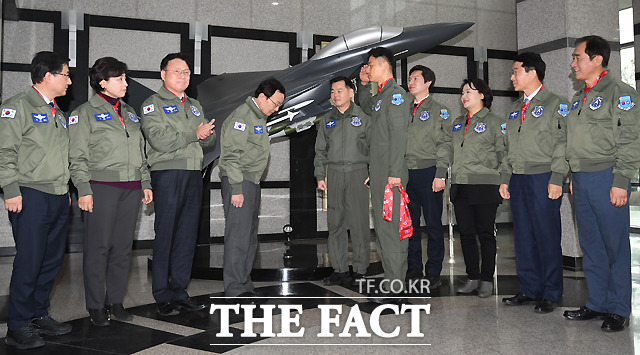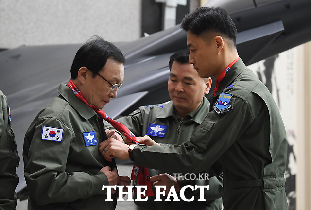 [더팩트ㅣ오산=이새롬 기자] 이해찬 더불어민주당 대표(왼쪽)와 민주당 지도부가 31일 오전 경기도 오산 공군작전사령부를 방문한 가운데, 이 대표가 공군의 '빨간 마후라'를 착용하고 있다.