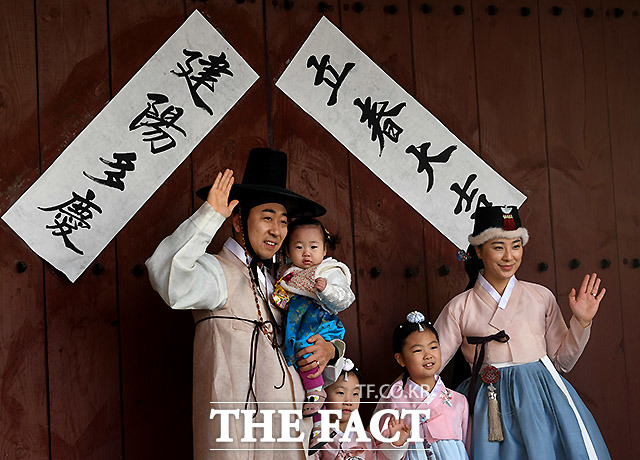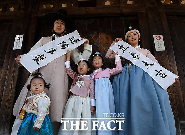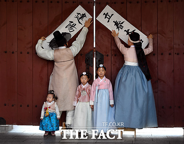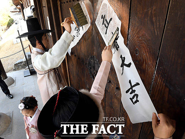 [더팩트ㅣ이효균 기자] 봄의 시작을 알리는 입춘을 맞은 4일 오전 서울 중구 남산골한옥마을에서 '입춘맞이 세시행사'가 열린 가운데 시민 가족이 한옥마을 대문에 '입춘첩'을 붙이고 있다.