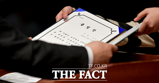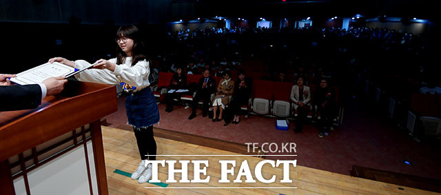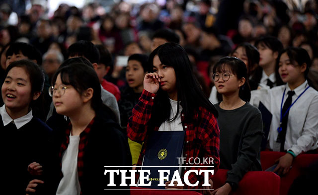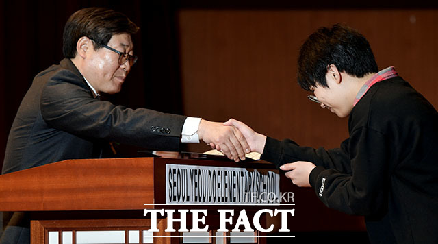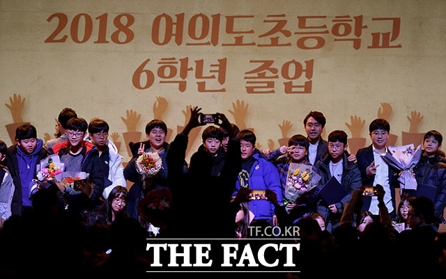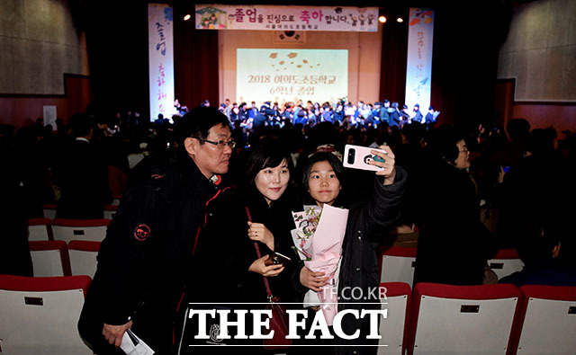 [더팩트ㅣ이덕인 기자] 서울여의도초등학교 졸업식이 15일 오전 서울 영등포구 여의도중학교 대강당에서 열린 가운데 졸업생 가족이 기념사진을 찍고 있다.