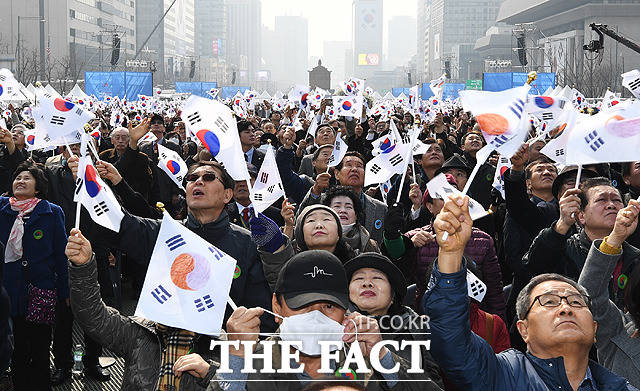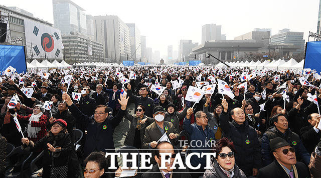 [더팩트ㅣ배정한 기자] 제100주년 3.1절 기념식이 1일 오전 서울 광화문 광장에서 열린 가운데 시민들이 태극기를 흔들며 대한 독립 만세를 외치고 있다.