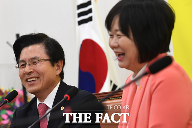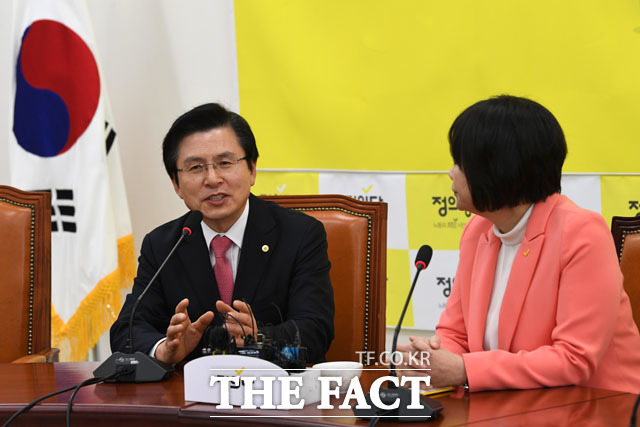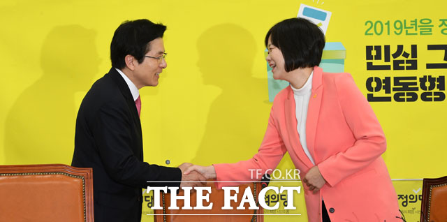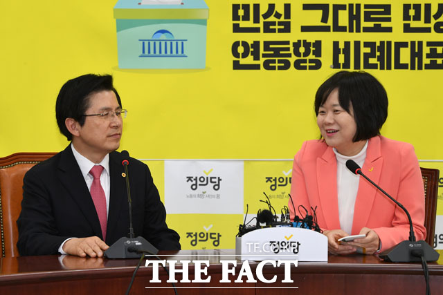 [더팩트 | 국회=남윤호 기자] 자유한국당 황교안 대표가 4일 오전 서울 여의도 국회 정의당 대표실을 찾아 이정미 대표와 인사를 하고 있다.