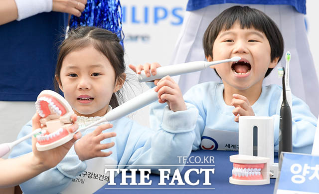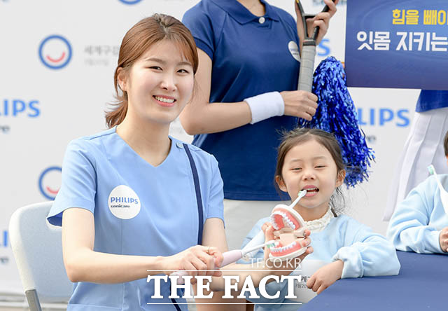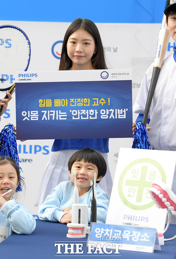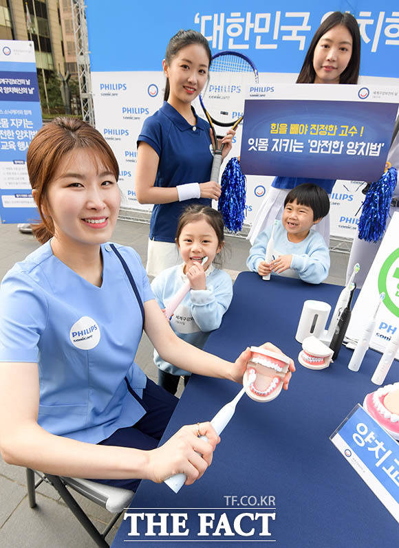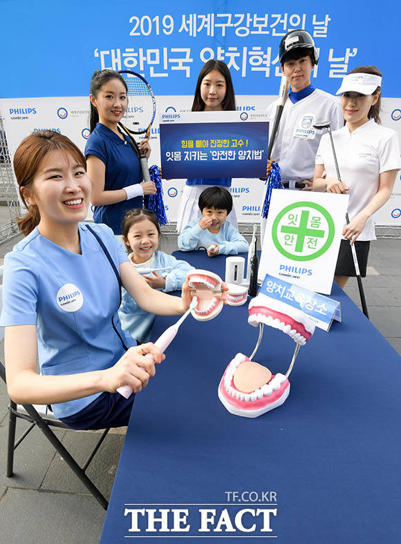[더팩트ㅣ김세정 기자] 필립스코리아의 구강헬스케어 브랜드인 소닉케어가 오는 20일 '세계 구강보건의 날'을 맞아 18일 오전 서울 중구 청계광장에서 잇몸 건강을 지키는 '안전한 양치법' 시민 교육 행사를 개최한 가운데 모델들이 '안전한 양치습관'의 중요성을 알리는 퍼포먼스를 펼치고 있다.