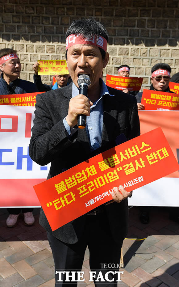 [더팩트ㅣ김세정 기자] 서울개인택시조합 소속 택시 기사들이 4일 오후 서울 중구 서울시청 서소문별관 앞에서 '타다 프리미엄 택시 거부' 집회를 열고 구호를 외치고 있다.