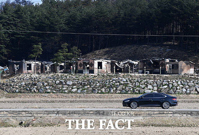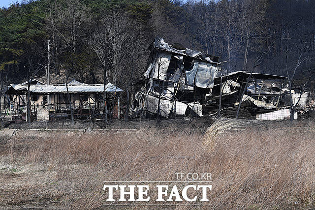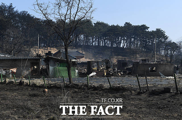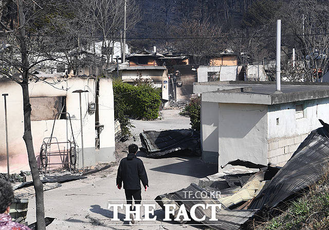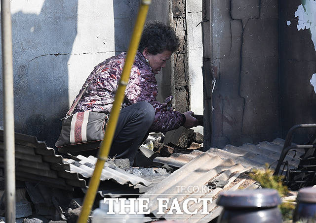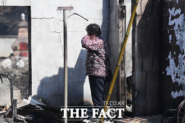 [더팩트ㅣ속초=배정한 기자] 지난 밤 고성에서 시작된 산불이 이어지고 있는 5일 오전 강원도 속초시 교동 인근의 한 마을에서 주민이 전소한 집을 나서며 오열을 하고 있다.