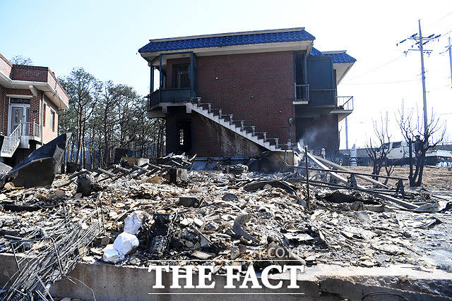지난 밤 고성에서 시작된 산불이 이어지고 있는 5일 오전 강원도 속초시 교동 인근의 한 마을에서 주민이 전소한 집을 나서며 오열을 하고 있다. / 속초=배정한 기자