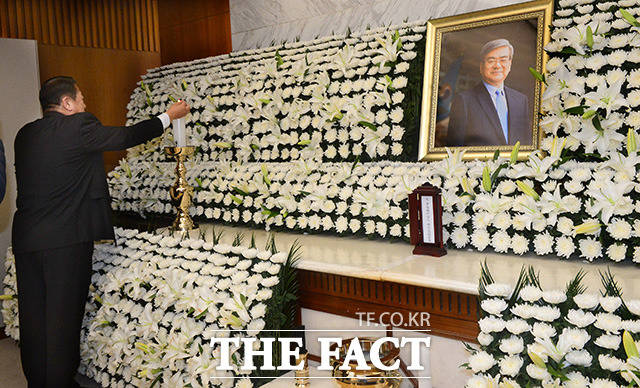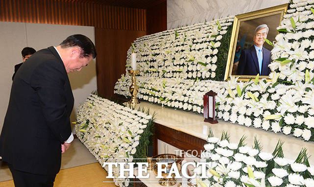 [더팩트ㅣ남용희 기자] 조양호 한진그룹 회장의 빈소가 12일 오전 서울 서대문구 신촌 세브란스 병원 장례식장에 마련된 가운데 한 직원이 분향하고 있다.