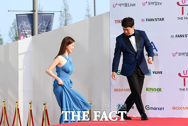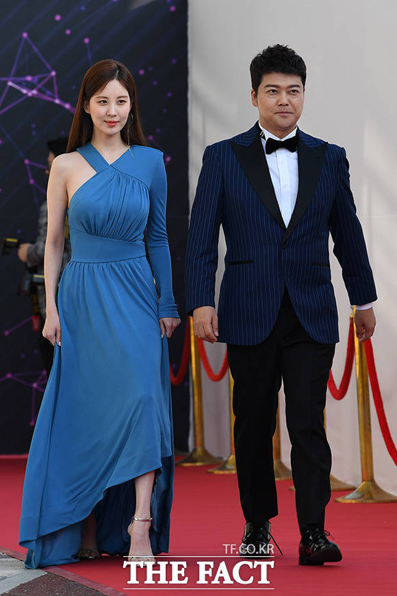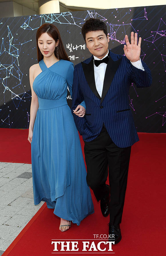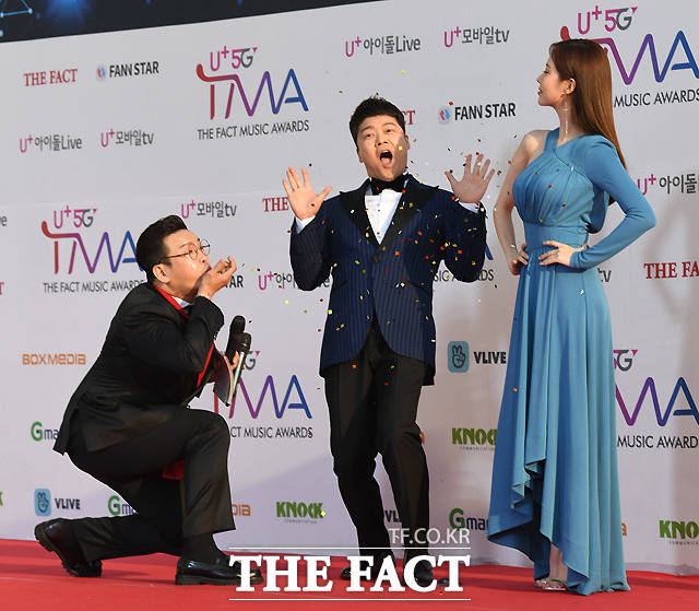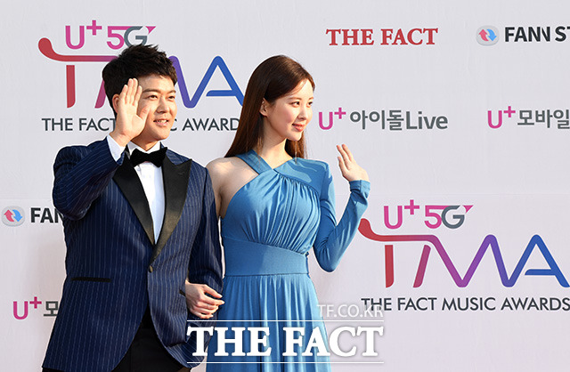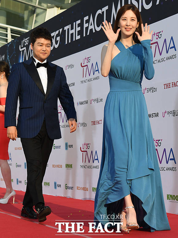 [더팩트ㅣ인천남동체육관=사진영상기획부] 더팩트가 주최하고 팬앤스타(FAN N STAR)가 주관하는 'U⁺5G 더팩트 뮤직 어워즈'(U⁺5G THE FACT MUSIC AWARDS, 'TMA')가 24일 오후 인천광역시 남동구 남동체육관에서 열린 가운데 사회를 맡은 방송인 전현무(왼쪽)와 가수 서현이 포토타임을 갖고 있다.