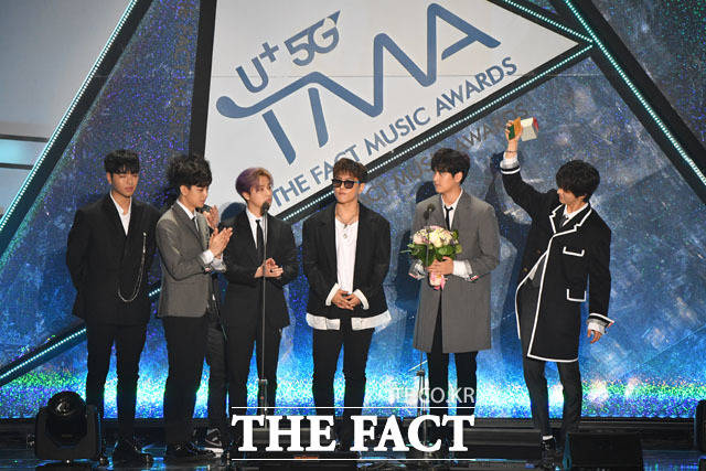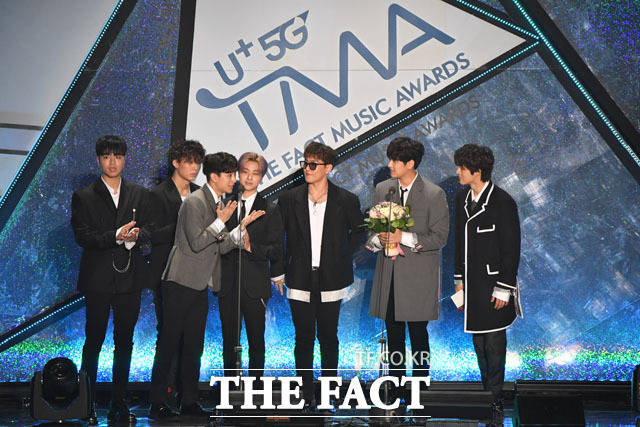 [더팩트ㅣ인천남동체육관=사진영상기획부] 더팩트가 주최하고 팬앤스타(FAN N STAR)가 주관하는 'U⁺5G 더팩트 뮤직 어워즈'(U⁺5G THE FACT MUSIC AWARDS, 'TMA')가 24일 오후 인천광역시 남동구 남동체육관에서 열린 가운데 그룹 올해의 Artist상을 수상하고 있다.