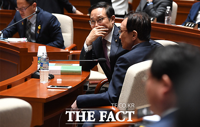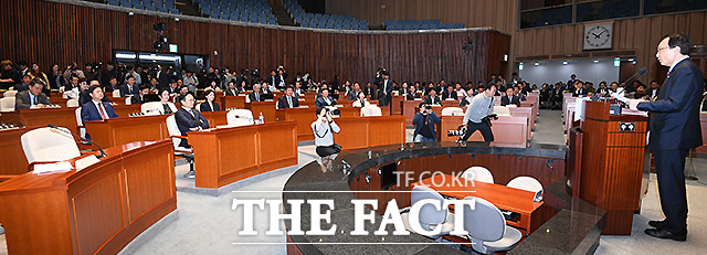 [더팩트ㅣ국회=이새롬 기자] 이해찬 더불어민주당 대표가 29일 오전 서울 여의도 국회에서 열린 의원총회에서 모두 발언을 하고 있다.