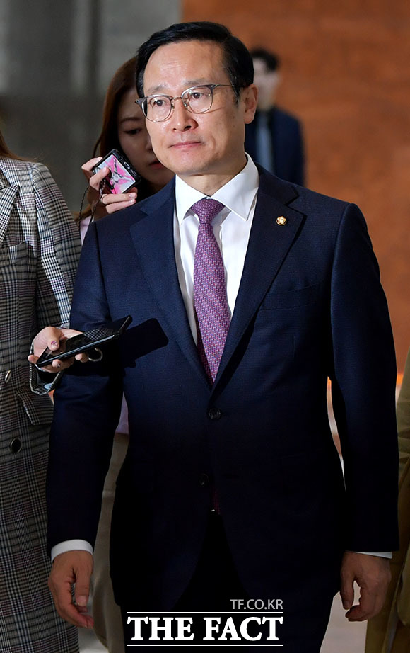 패스트트랙(신속처리안건)을 둘러싼 여야의 대치가 계속되는 가운데 더불어민주당 홍영표 원내대표가 29일 오후 서울 여의도 국회에서 열린 의원총회에 참석해 심각한 표정으로 전화를 받고 있다. /국회=이덕인 기자