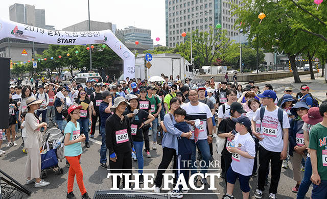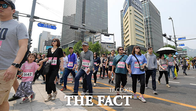 [더팩트ㅣ김세정 기자] 세종대로 차 없는 거리의 날을 맞이해 12일 오후 서울 종로구 광화문 세종대로에서 '2019 걷자, 도심 보행길!' 행사가 열린 가운데 참가자들이 힘차게 출발하고 있다.