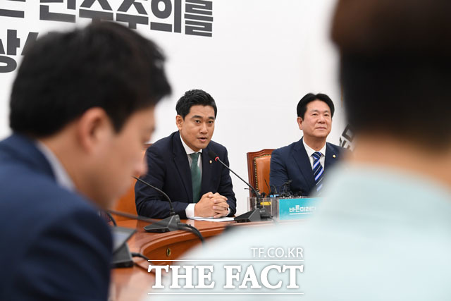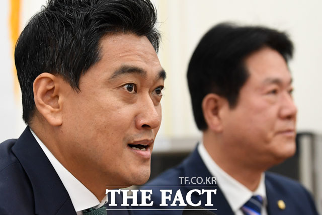 [더팩트 | 국회=남윤호 기자] 오신환 바른미래당 신임 원내대표가 16일 오전 서울 여의도 국회에서 기자간담회를 열고 당에 직면한 현안에 대해 답변하고 있다.