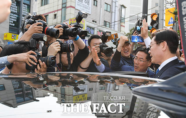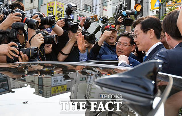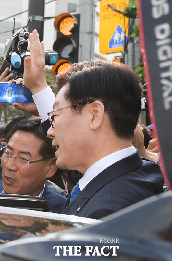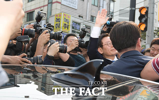 [TF포토] 지지자들 환호받으며 차량에 탑승하는 이재명 지사