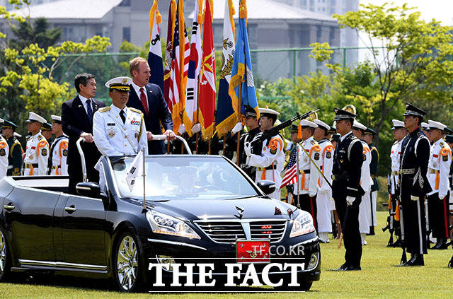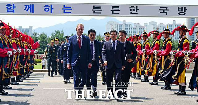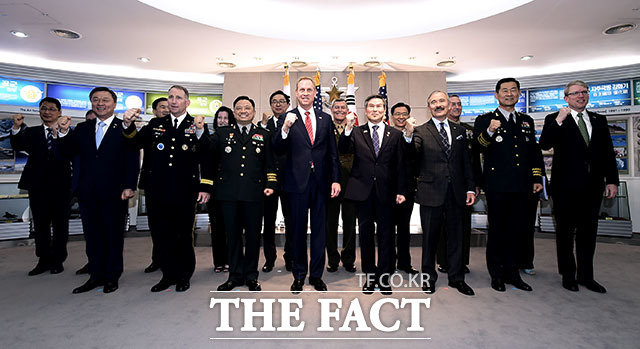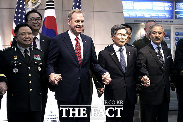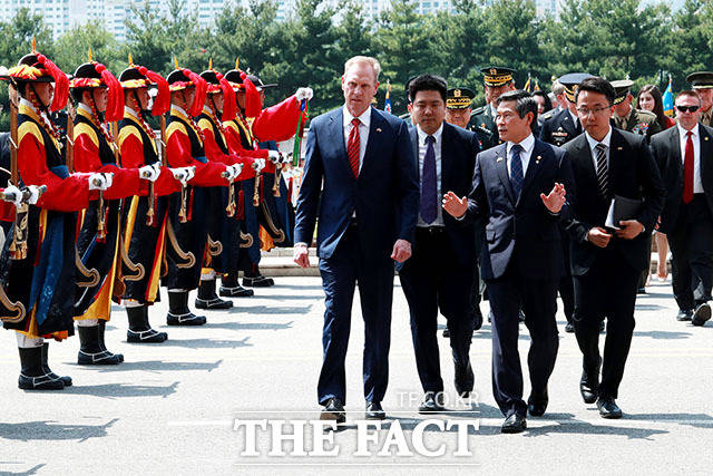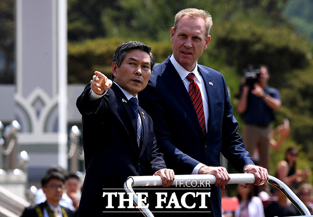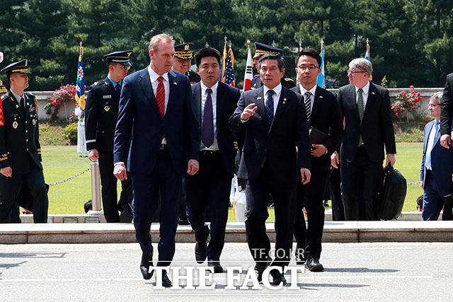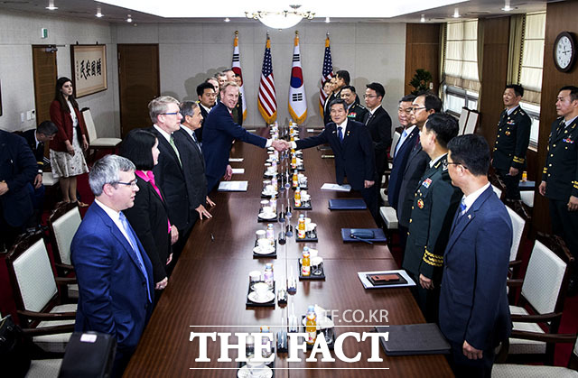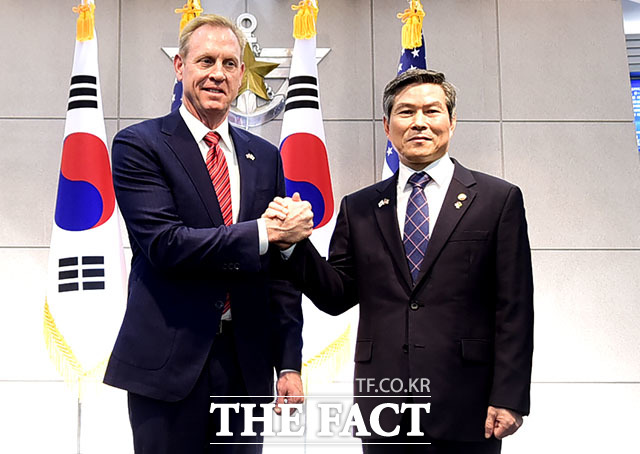 [더팩트ㅣ이덕인 기자] 3일 오전 서울 용산구 국방부에서 열린 한미국방장관회담에서 정경두 국방부 장관(오른쪽)과 패트릭 새너핸 미국 국방부 장관 대행(왼쪽)이 회담에 앞서 악수를 하고 있다.