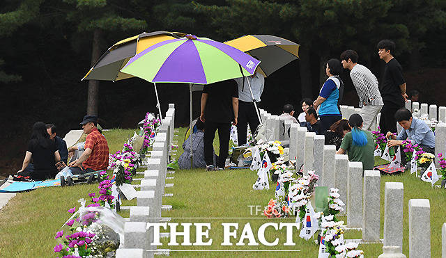 [더팩트ㅣ이새롬 기자] 제 64회 현충일인 6일 오전 서울 동작구 국립서울현충원을 찾은 참배객들이 묘비 앞에 텐트를 설치하고 있다.