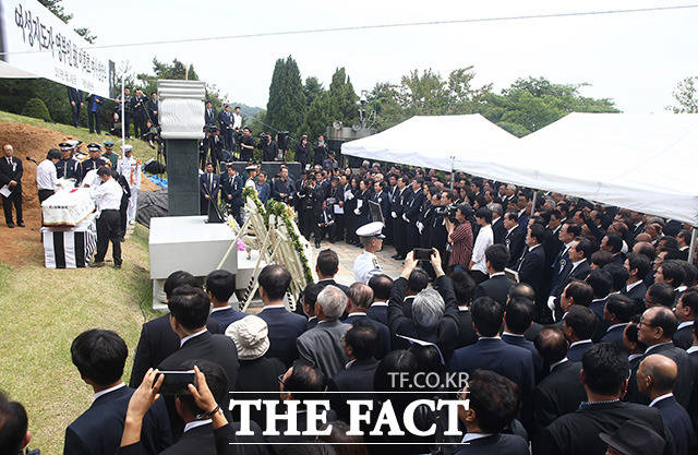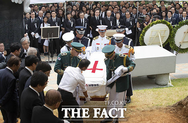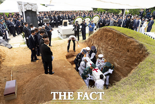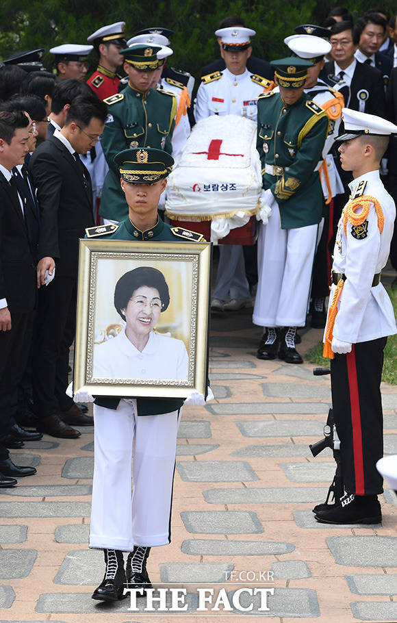[더팩트ㅣ임영무 기자] 고 이희호 여사의 안장식이 14일 오전 서울시 동작구 국립서울현충원에서 열린 가운데 국군의장대가 운구하고 있다. 고인은 김대중 전 대통령의 묘소에 합장된다.