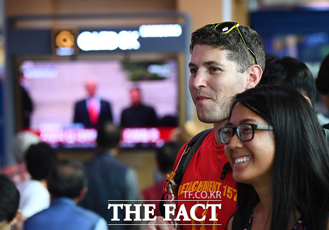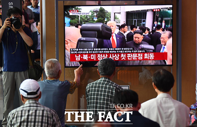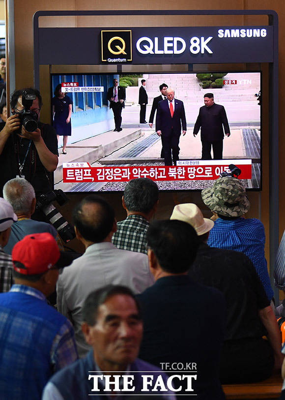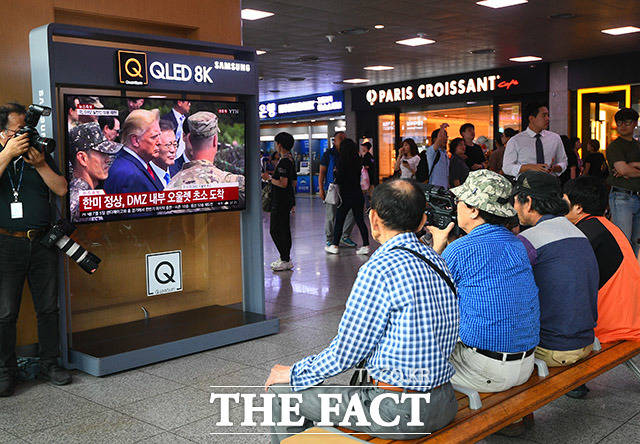 [더팩트ㅣ이동률 기자] 30일 오후 서울 용산구 서울역 대합실에서 시민들이 남·북·미 정상들의 판문점 JSA 회동을 TV로 지켜보고 있다. 북미 정상의 이날 판문점 만남은 정전 66년 만의 일이다.
