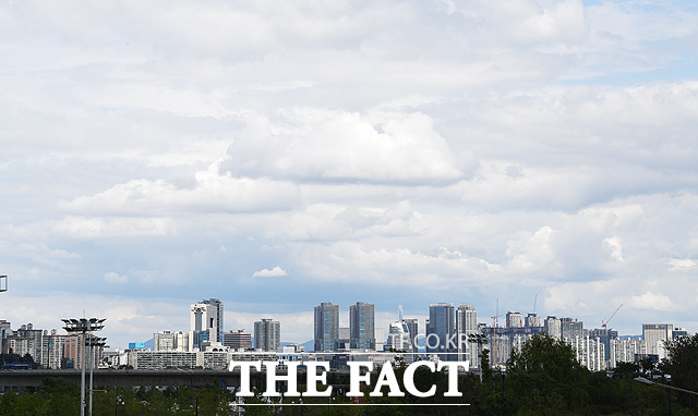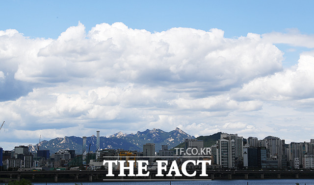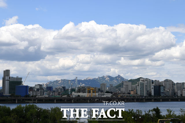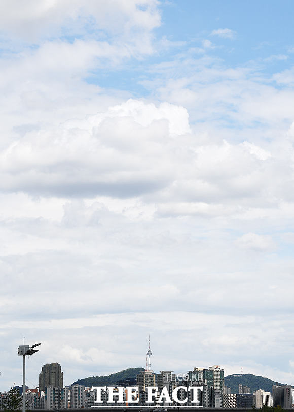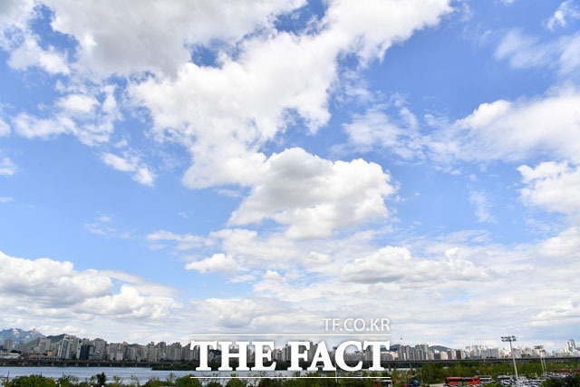[더팩트ㅣ배정한·남윤호 기자] 낮 기온이 32도까지 오르며 무더운 여름 날씨를 보인 8일 오후 서울 여의도 한강공원에서 바라본 하늘에 새하얀 구름이 떠다니고 있다. 미세먼지 농도는 원활한 대기 확산과 강수의 영향으로 전국이 ‘좋음’ 수준을 보이고 있다.