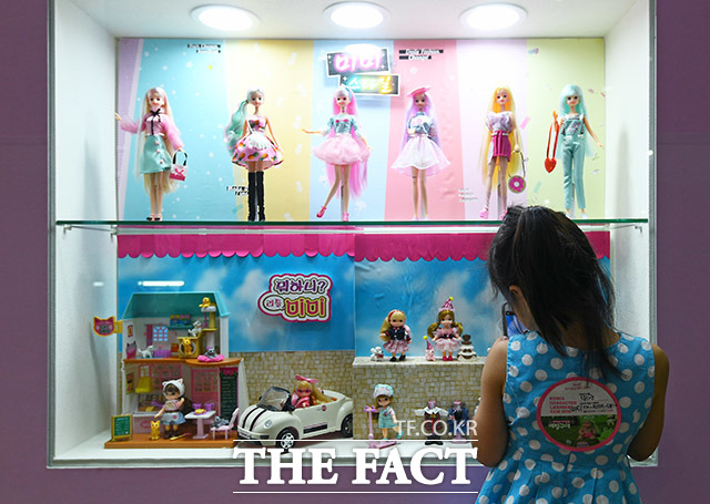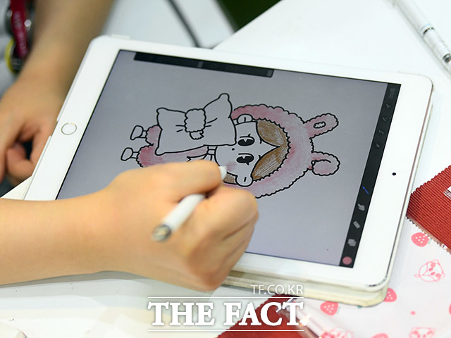 다양한 캐릭터 상품을 관람객들이 살펴보고 있다.