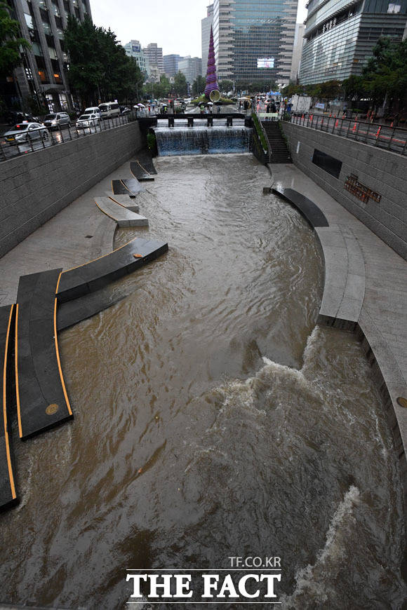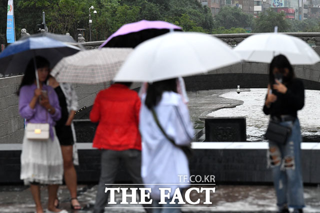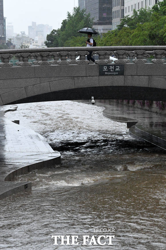 장마전선의 영향으로 서울에 올해 처음 호우경보가 발효된 26일 오전 서울 종로구 청계광장 청계천 산책로 출입이 통제되고 있다./남윤호 기자