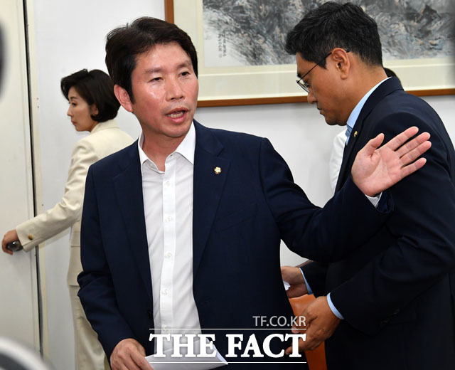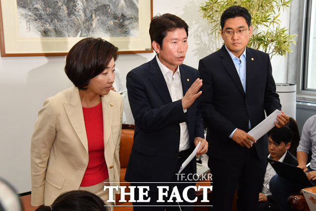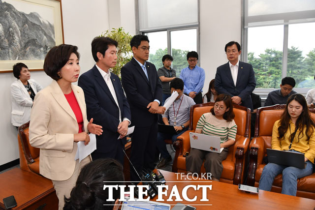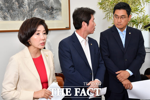 [더팩트 | 국회=남윤호 기자] 자유한국당 나경원, 더불어민주당 이인영, 바른미래당 오신환 원내대표(왼쪽부터)가 29일 오후 서울 여의도 국회에서 여야 교섭단체 3당 원내대표 회동을 마친 뒤 임시 국회 협의안을 밝히고 있다.