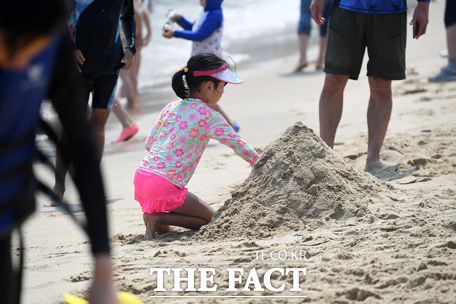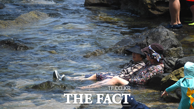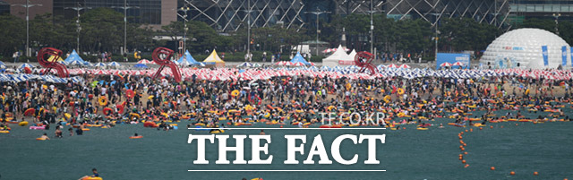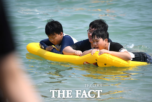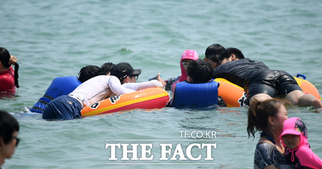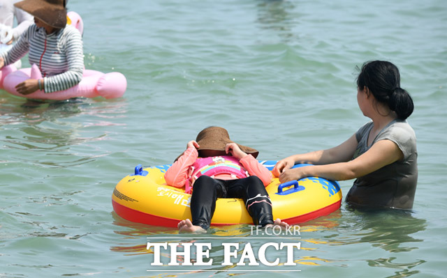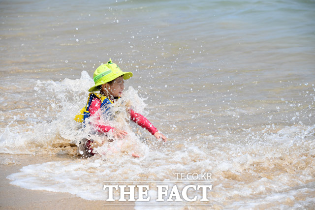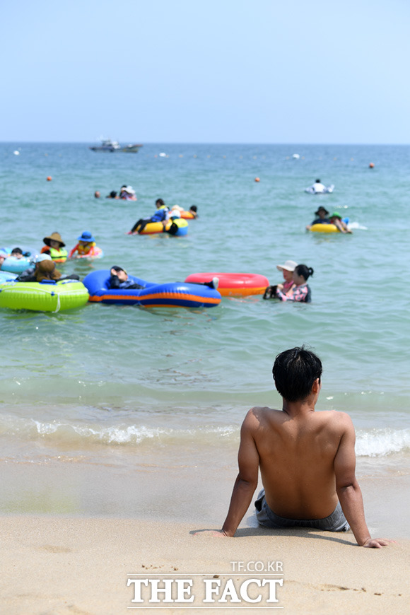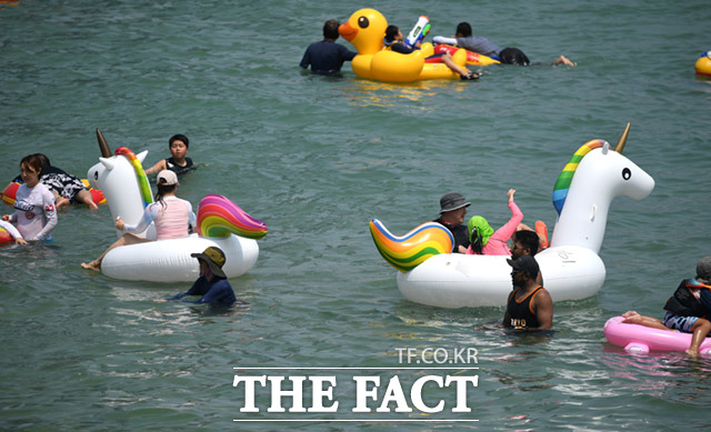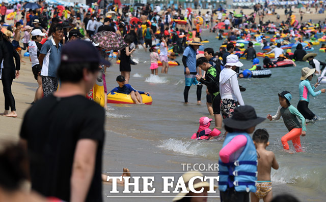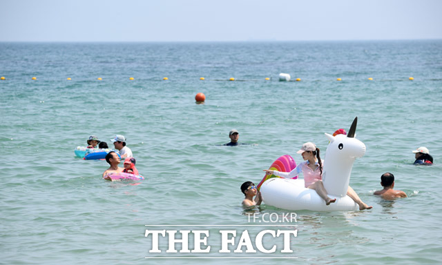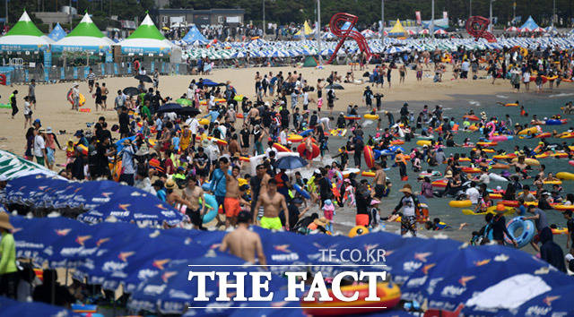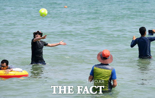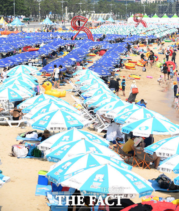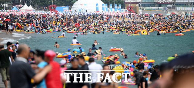 [더팩트ㅣ부산=임세준 기자] 전국적으로 폭염 경보가 내려진 4일 오후 부산 해운대구 해운대해수욕장에서 많은 피서객들이 물놀이를 즐기며 더위를 식히고 있다.