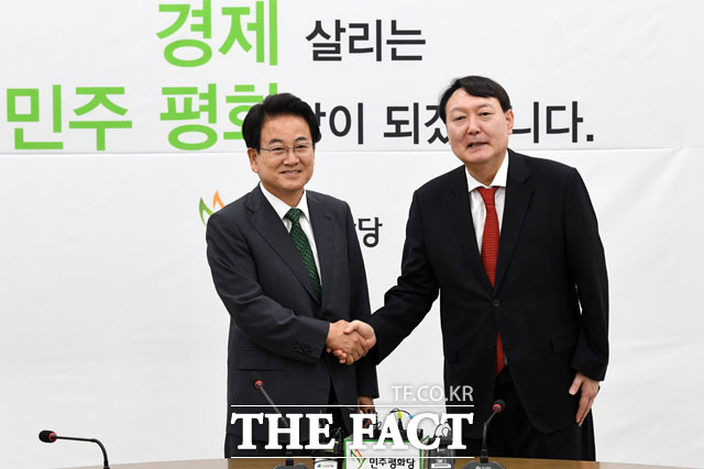 [더팩트 | 국회=남윤호 기자] 윤석열 검찰총장(오른쪽)이 8일 오전 서울 여의도 국회에서 정동영 민주평화당 대표를 만나 악수를 하고 있다.