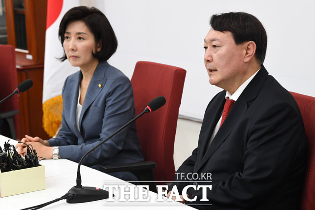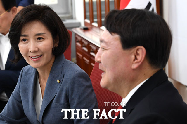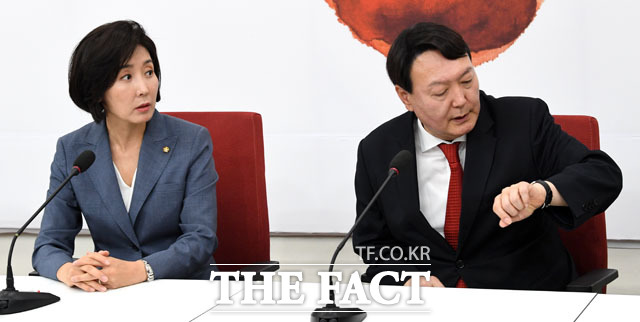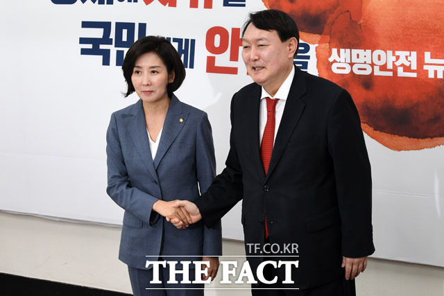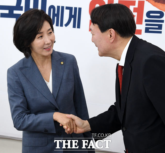 [더팩트 | 국회=남윤호 기자] 윤석열 검찰총장(오른쪽)이 8일 오후 서울 여의도 국회 자유한국당 원내대표실을 찾아 나경원 원내대표와 악수를 나누고 있다.