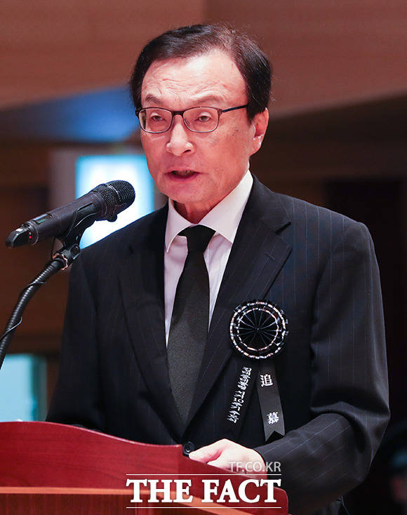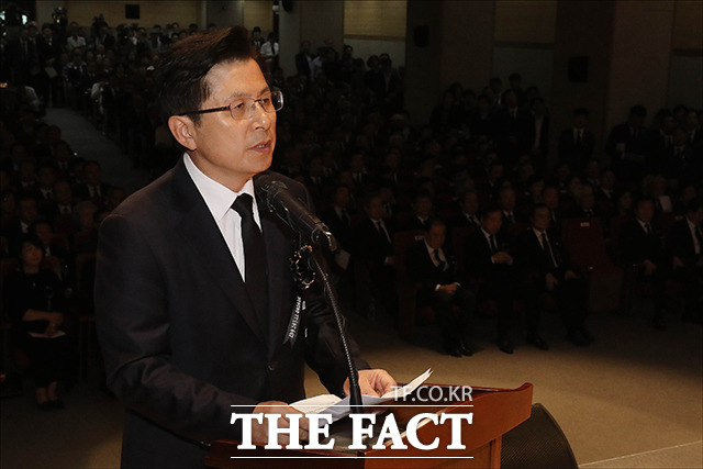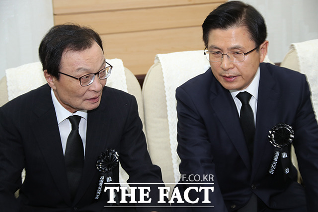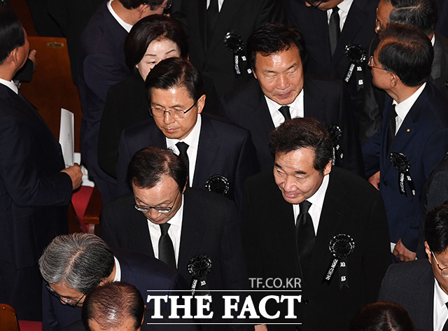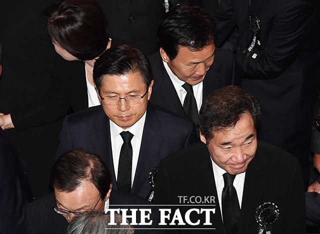 [더팩트|이선화 기자] 이해찬 더불어민주당 대표(왼쪽)와 황교안 자유한국당 대표가 18일 오전 서울 동작구 국립서울현충원에서 열린 '김대중 전 대통령 서거 10주기 추도식'에 참석해 이낙연 국무총리의 추도사를 경청하고 있다.