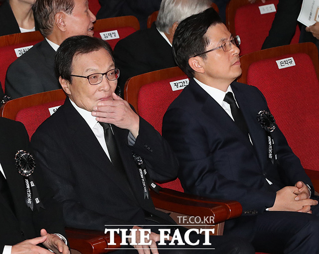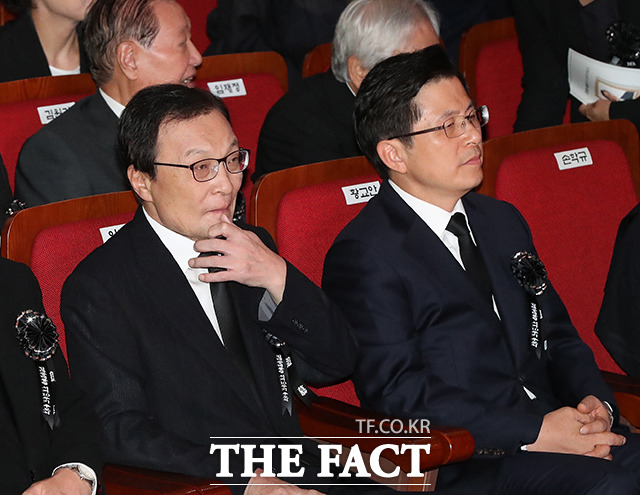 이해찬 더불어민주당 대표(왼쪽)와 황교안 자유한국당 대표가 18일 오전 서울 동작구 국립서울현충원에서 열린 '김대중 전 대통령 서거 10주기 추도식'에 참석해 이낙연 국무총리의 추도사를 경청하고 있다. /이선화 기자