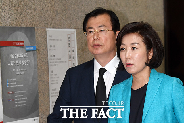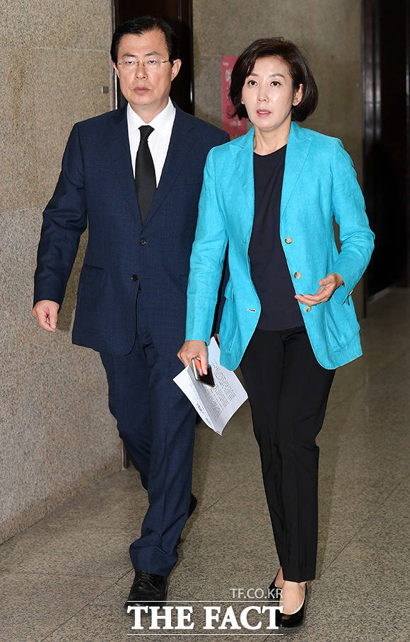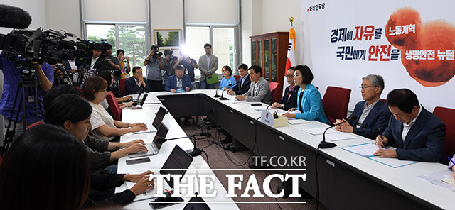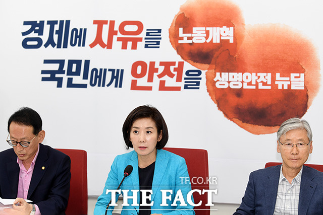 [더팩트ㅣ국회=남용희 기자] 나경원 자유한국당 원내대표(가운데)가 18일 오후 서울 여의도 국회 자유한국당 원내대표실에서 열린 인사청문회 대책회의에서 발언을 하고 있다.