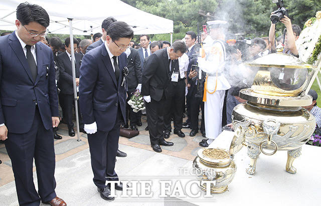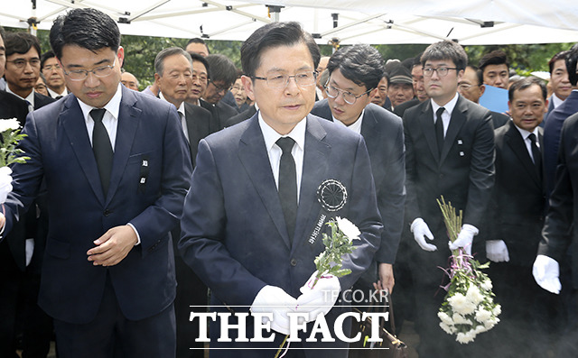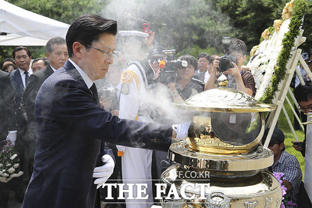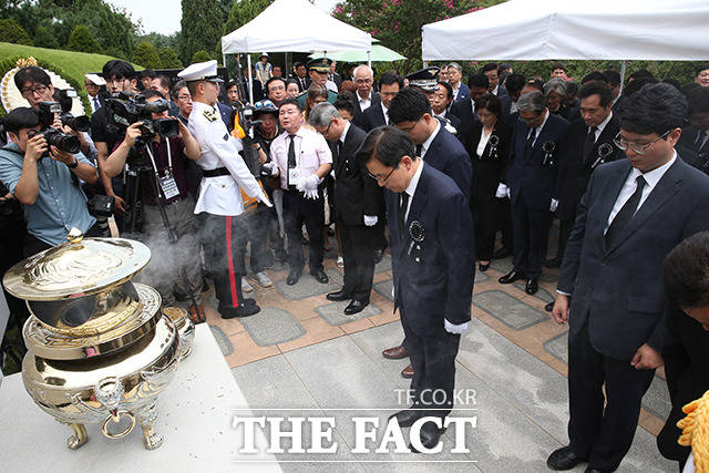 [더팩트|이선화 기자] 황교안 자유한국당 대표가18일 오전 서울 동작구 국립서울현충원 김대중 전 대통령 묘소를 방문해 분향하고 있다.