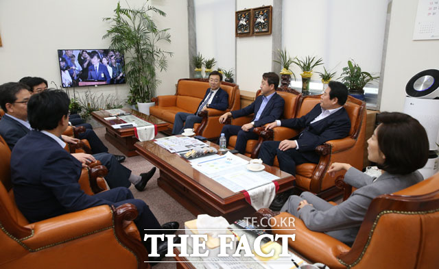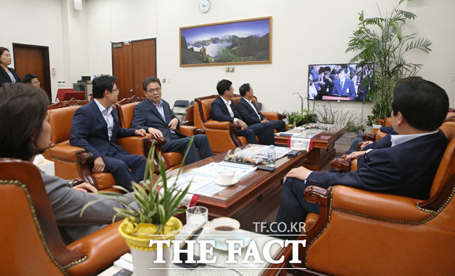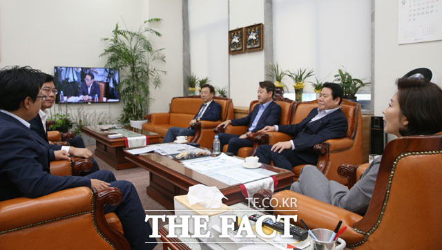[더팩트 | 국회=배정한 기자] 조국 법무부 장관 후보자의 인사청문회가 6일 오전 서울 여의도 국회에서 열린 가운데, 나경원 자유한국당 원내대표와 지도부가 원내대표실에서 청문회 생중계 방송을 시청하고 있다.