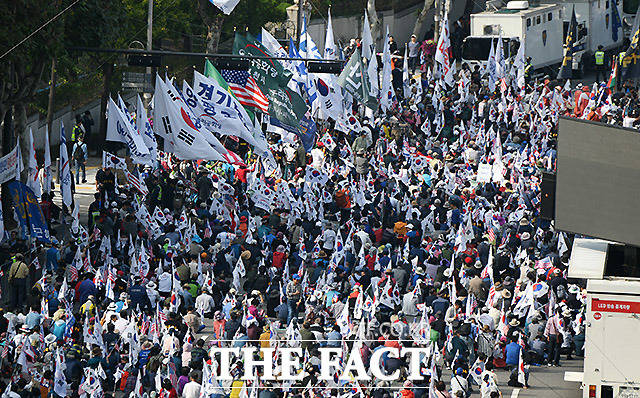 [TF포토] 박근혜 전 대통령 병원 앞에서 열린 태극기 집회