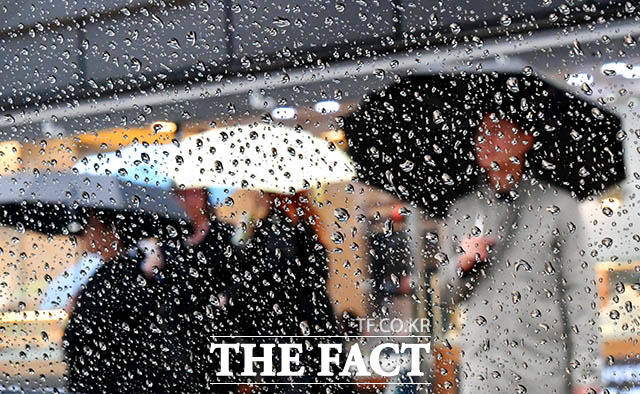 [더팩트ㅣ이덕인 기자] 전국이 흐리고 대부분 지역에서 비가 내린 7일 오후 서울 중구 다동길에서 우산을 쓴 시민들이 물방울에 비치고 있다.