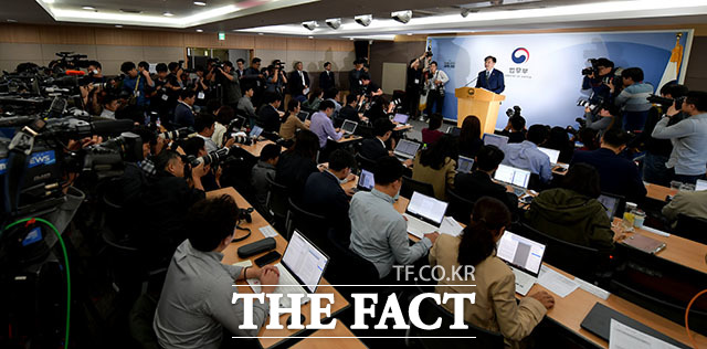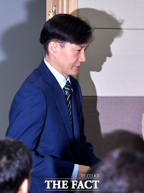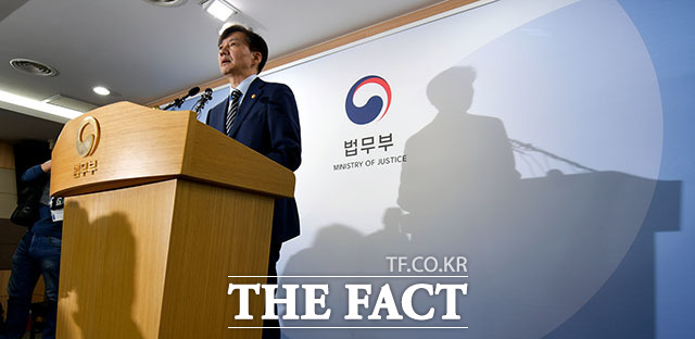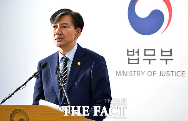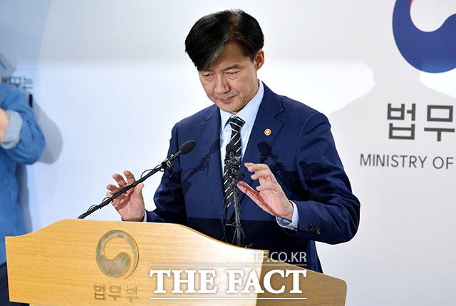 [더팩트ㅣ과천=이덕인 기자] 조국 법무부 장관이 8일 오후 경기도 과천 정부과천종합청사에서 검찰개혁방안 브리핑을 갖고 있다.