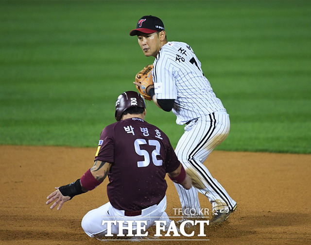 [더팩트ㅣ배정한 기자] 2019 KBO 포스트시즌 준플레이오프 4차전 키움 히어로즈와 LG 트윈스의 경기가 10일 오후 서울 송파구 잠실야구장에서 열렸다. 6회초 LG 정주현이 병살을 시도하고 있다.