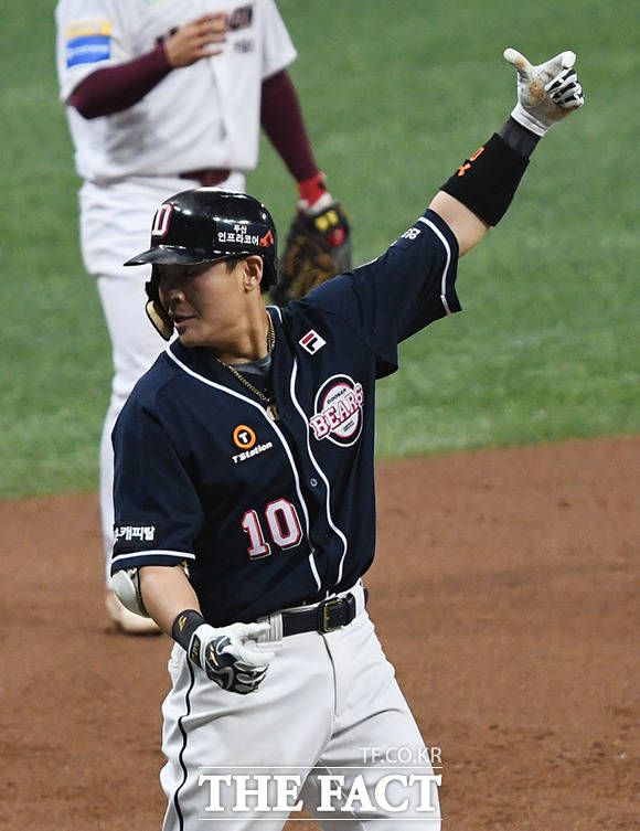 [더팩트ㅣ배정한 기자] 프로야구 2019 신한은행 마이카 KBO리그 한국시리즈 3차전 두산 베어스와 키움 히어로즈의 경기 25일 오후 서울 구로구 고척스카이돔에서 열린 가운데 3회초 두산 박세혁이 1타점 3루타를 친 뒤 기뻐하고 있다.