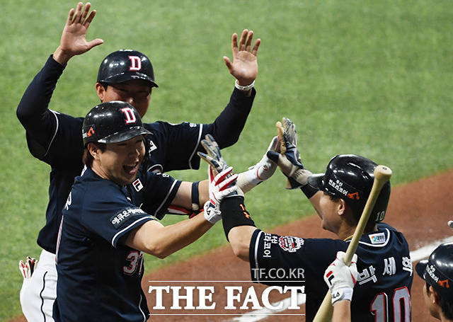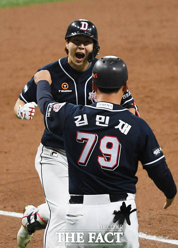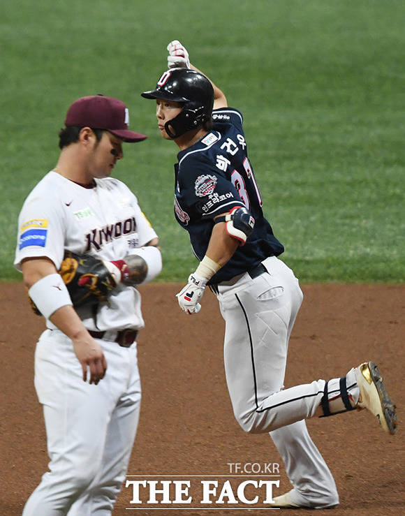 [더팩트ㅣ배정한 기자] 프로야구 2019 신한은행 마이카 KBO리그 한국시리즈 3차전 두산 베어스와 키움 히어로즈의 경기 25일 오후 서울 구로구 고척스카이돔에서 열린 가운데 3회초 두산 박건우가 투런 홈런을 친 뒤 홈으로 들어오고 있다.