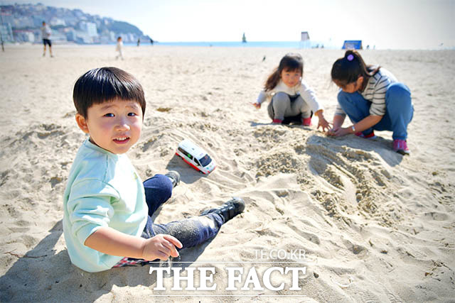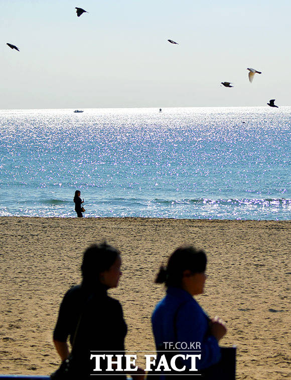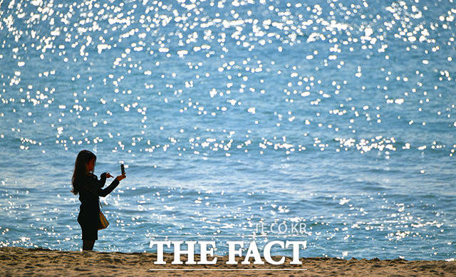 [더팩트ㅣ부산=이덕인 기자] 전국이 맑은 날씨를 보인 26일 오전 부산 해운대해수욕장을 찾은 관광객들이 사진을 찍으며 바다를 만끽하고 있다.