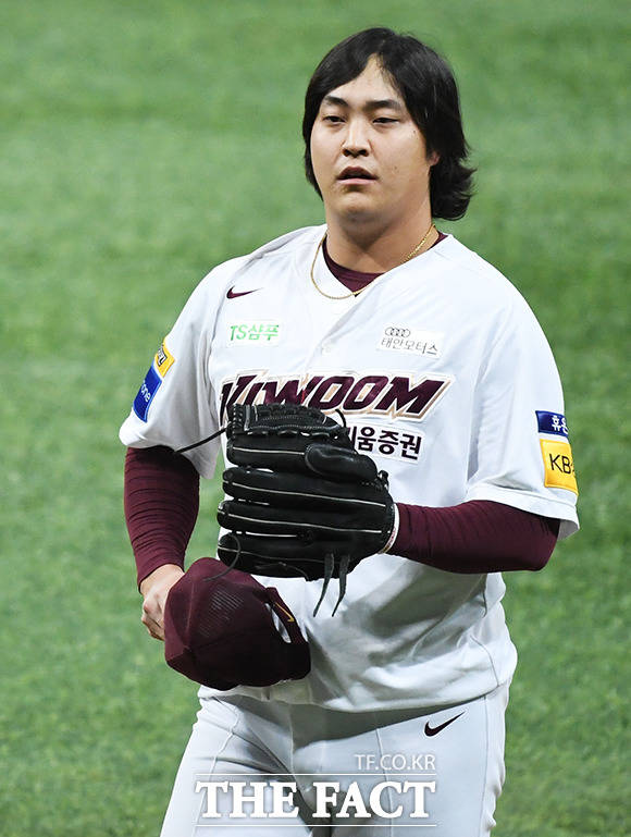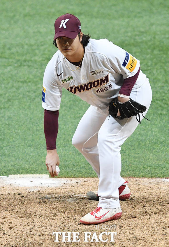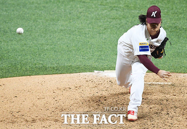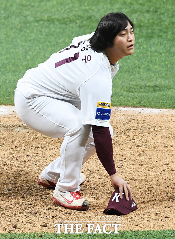 [더팩트ㅣ배정한 기자] 프로야구 2019 신한은행 마이카 KBO리그 한국시리즈 4차전 두산 베어스와 키움 히어로즈의 경기 26일 오후 서울 구로구 고척스카이돔에서 열렸다. 6회초 키움 조상우가 투구를 하던 중 모자가 벗겨지고 있다.
