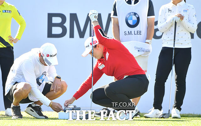 [더팩트ㅣ부산=이덕인 기자] 미국여자프로골프(LPGA) 투어 BMW 레이디스 챔피언십(총상금 200만 달러, 약 23억6000만 원) 최종라운드가 27일 부산 기장군 'LPGA 인터내셔널 부산'에서 진행된 가운데 장하나가 티업 전 모형 자동차를 만지고 있다.