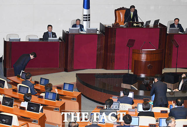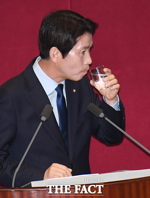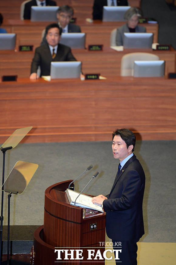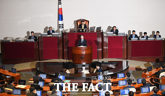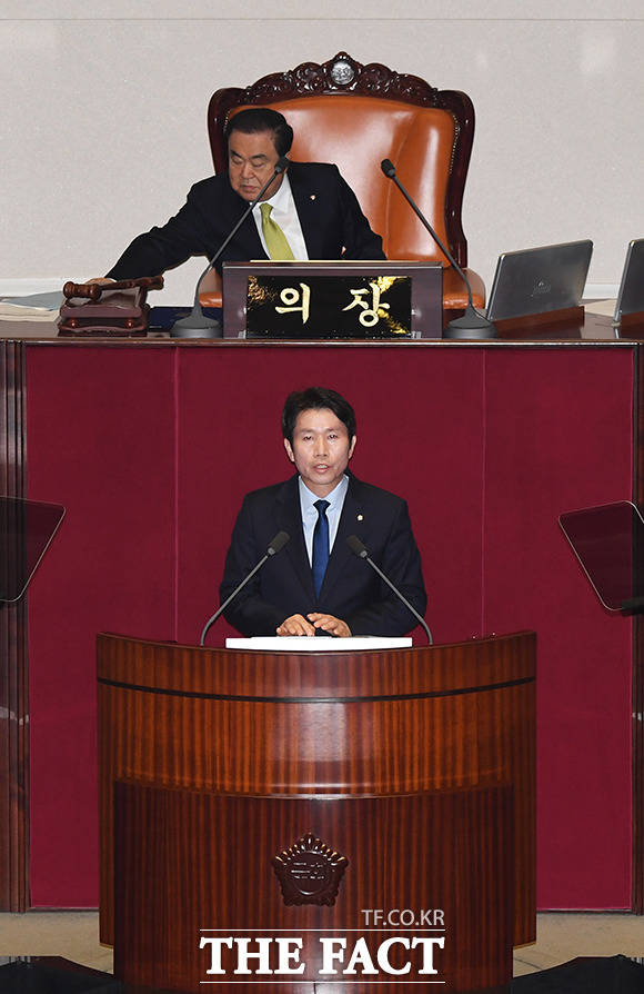 [더팩트ㅣ국회=배정한 기자] 이인영 더불어민주당 원내대표가 28일 오전 서울 여의도 국회에서 열린 본회의에 참석해 교섭단체 대표연설을 하고 있다.