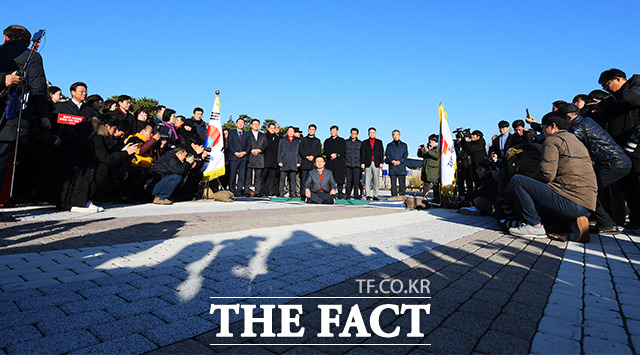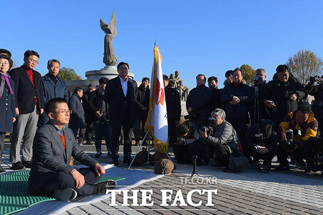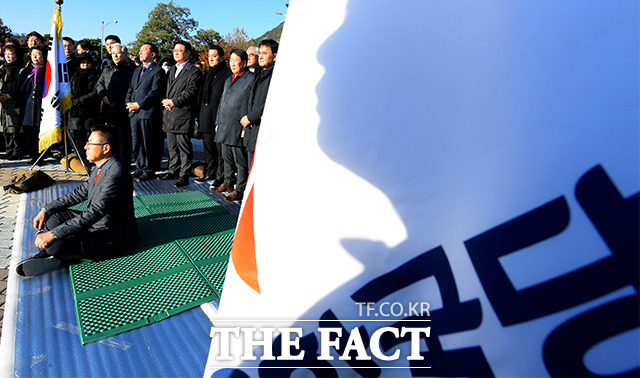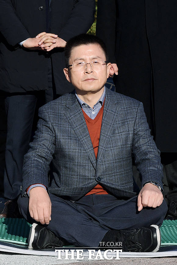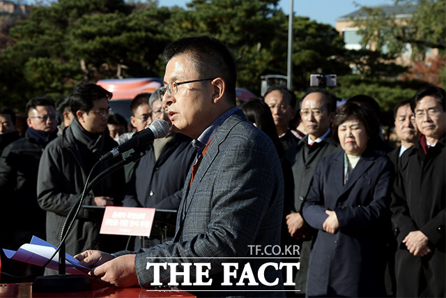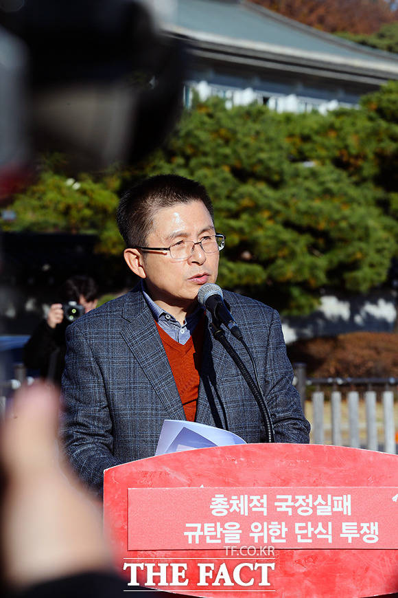 [더팩트|이선화 기자] 황교안 자유한국당 대표가 20일 오후 서울 종로구 청와대 앞 분수대 광장에서 국정 대전환을 촉구하기 위한 단식을 선언하며 대국민호소문을 발표하고 있다.