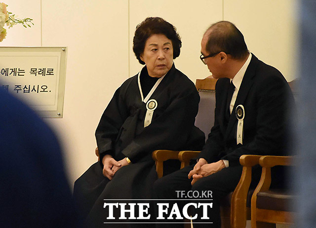 [더팩트ㅣ수원=이효균 기자] 고 김우중 전 대우그룹회장의 부인 정희자 여사(왼쪽)와 장남 김선엽 씨가 이 10일 경기 수원시 아주대병원 장례식장에서 이야기를 하고 있다.
