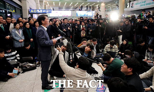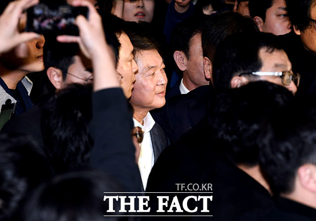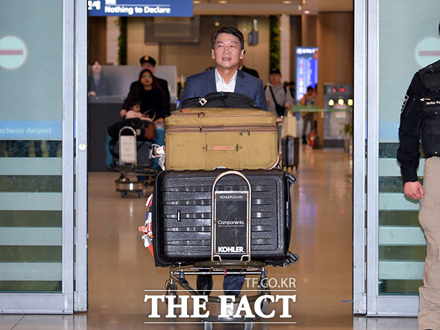 [더팩트ㅣ인천국제공항=이덕인 기자] 정계 복귀를 선언한 안철수 전 바른미래당 의원이 19일 오후 지지자들의 환호를 받으며 인천국제공항 제1터미널 입국장을 나서고 있다.
